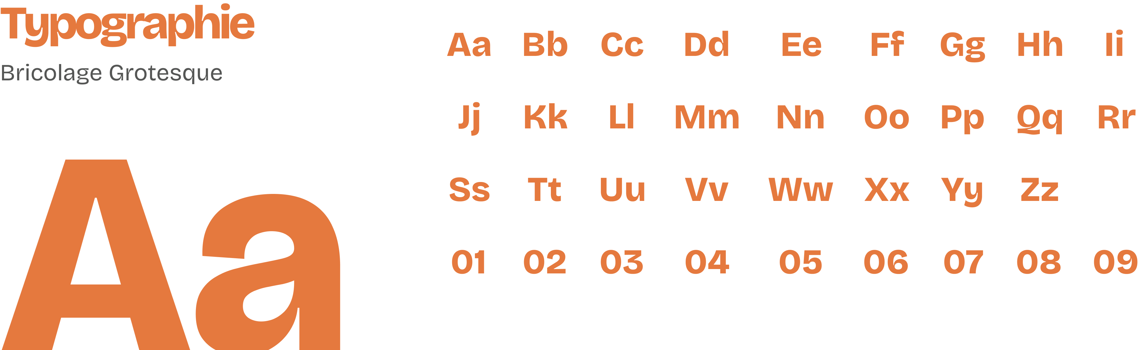 La typographie principale, Bricolage Grotesque, structure l’identité à elle seule. Son caractère moderne et lisible permet de maintenir une cohérence forte sans multiplier les styles. Elle renforce la proximité et la clarté du discours.